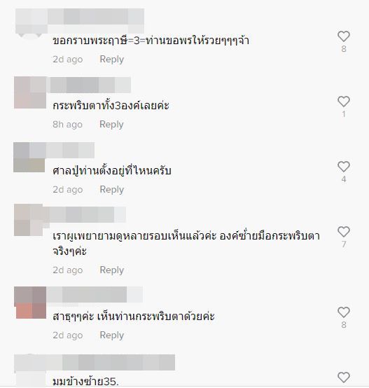 ทั้งนี้ หลังจากเจ้าตัวโพสต์ไป ก็มีผู้ใช้ TikTok เข้ามาแสดงความเห็นเป็นจำนวนมากว่า รูปปั้นฤาษีองค์ซ้ายสุดนั้นกะพริบตา พร้อมกับบอกว่า ถ้าถูกหวยรางวัลใหญ่จะถวายศาลใหม่ให้ ขณะเดียวกันเจ้าของโพสต์ได้ระบุในคอมเมนต์ด้วยว่า ไม่ได้มีการใช้แอปฯ ตัดต่อหรือแต่งภาพใดๆ
