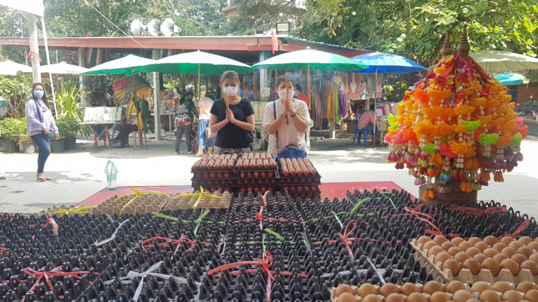 วันที่ 4 มกราคม 2565 ที่ วัดสว่างอารมณ์ แคแถว ต.ขุนแก้ว อ.นครชัยศรี จ.นครปฐม พบ นางมาลี มงคลศิลป์ อายุ 58 ปี ชาวบางแค กทม. นำไข่ไก่สด จำนวน 1,000 ฟอง มาแก้บน “พระเงิน พระทอง” หรือหลวงพ่อรวย พระพุทธรูปศักดิ์สิทธิ์ของวัดสว่างอารมณ์ นำไข่ไก่สดทั้งหมดวางเรียงรายถวายอยู่ด้านหน้าทางขึ้นศาลาการเปรียญ พร้อมจุดธูปอธิษฐานแก้บน โดยมีพราหมณ์เป็นผู้กล่าวนำ บอกเทพเทวดาฟ้าดินในการแก้บนครั้งนี้