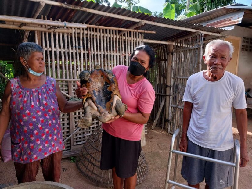 มีตายายสองคนได้พบเต่ายักษ์คลานเข้ามาหลังบ้าน จึงได้เดินทางเข้าไปตรวจสอบที่บ้านเลขที่ 8 บ้านกระชาย หมู่ที่ 14 ต.ยาง อ.ศีขรภูมิ จ.สุรินทร์ พบคุณตาเมือง ทองย้อย อายุ 77 ปี และคุณยายสำเภา ทองย้อยอายุ 70 ปี สองสามีภรรยา พาเข้าไปดูภายในสวน ซึ่งมีพื้นที่ประมาณ 1 ไร่เศษ พบเต่าขนาดใหญ่ถูกขังไว้ ให้กินผักบุ้งอยู่ภายในท่อซีเมนต์