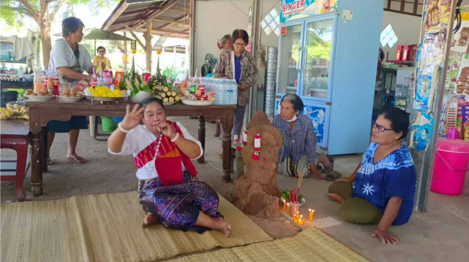 ที่บ้านดังกล่าวพบว่าที่บริเวณหน้าร้านขายของชำได้ มีการเตรียมทำพิธีบวงสรวงจอมปลวกดังกล่าว โดยจอมปลวกในวันนี้ มีลักษณะคล้าย เศียรพระพุทธรูป ซึ่งชาวบ้านได้เตรียม ขันดอกไม้ธูปเทียน น้ำแดง น้ำเขียว น้ำส้ม น้ำเปล่า หมากพลู ธูป เทียน ยาสูบ ไข่ต้ม 99 ลูก กล้วยสุกและผลไม้อื่นๆ อีกมากมายจัดวางไว้บนโต๊ะ ตั้งอยู่ข้างๆกับจอมปลวก มีชาวบ้านจำนวนหนึ่งพร้อมนางรำ และแม่หมอที่ร่วมทำพิธีในบริเวณดังกล่าวเพื่อถวายเครื่องเซ่นไหว้ให้กับพญาปานแขน (จอมปลวก) คล้ายเศียรพระพุทธรูปด้วย