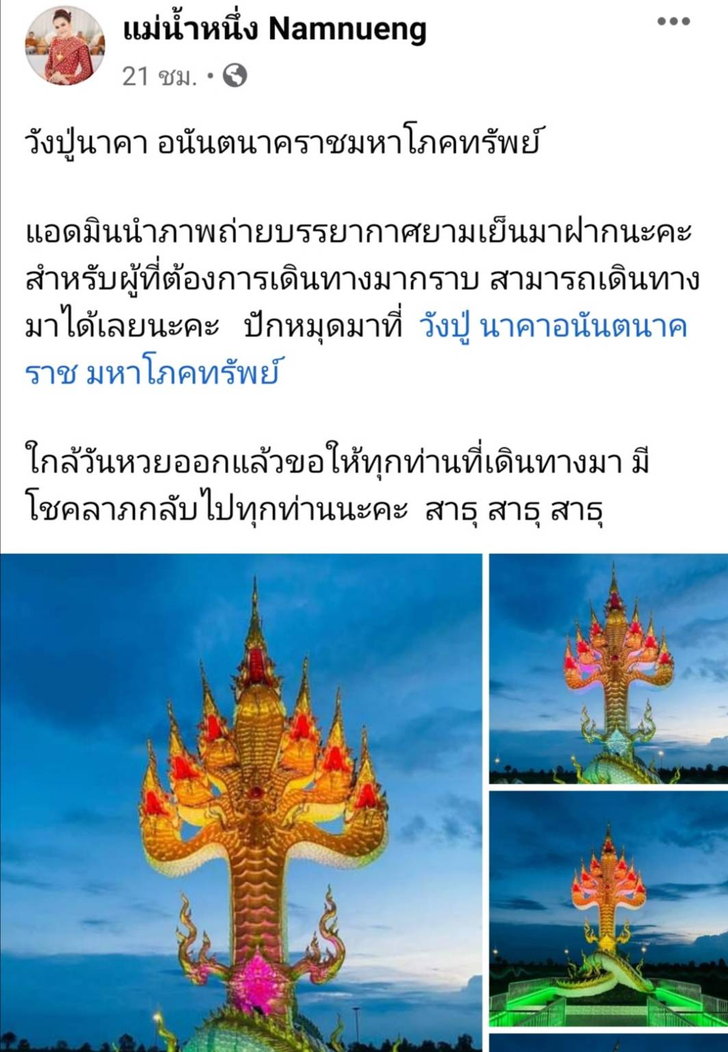 พรุ่งนี้แล้วนะคะ สำหรับวันที่หลายๆ คนรอลุ้น และรอคอย สำหรับการออกรางวัลสลากกินแบ่งรัฐบาล งวดประจำวันที่ 16 ตุลาคม 2564ล่าสุด เมื่อวันที่ 14 ต.ค. 2564 เพจ แม่น้ำหนึ่ง Namnueng ของ แม่น้ำหนึ่ง ภิรดา ธนโชติจินดา ได้โพสต์ภาพของวังปู่นาคา พร้อมระบุแคปชั่นว่า “วังปู่นาคา อนันตนาคราชมหาโภคทรัพย์ แอดมินนำภาพถ่ายบรรยากาศยามเย็นมาฝากนะคะ สำหรับผู้ที่ต้องการเดินทางมากราบ สามารถเดินทางมาได้เลยนะคะ ปักหมุดมาที่ วังปู่ นาคาอนันตนาคราช มหาโภคทรัพย์ ใกล้วันหวยออกแล้วขอให้ทุกท่านที่เดินทางมา มีโชคลาภกลับไปทุกท่านนะคะ สาธุ สาธุ สาธุ”