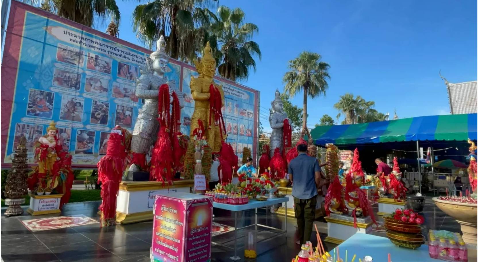 จากการสอบถาม นายรุ่งนที ไขศรี อายุ 35 ปี พ่อค้าขายไก่ย่าง ได้นำร้านไก่ย่างมาปิ้งแจกจ่ายชาวบ้านที่มาทำบุญบริเวณหน้าท้าวเวสสุวรรณ หลังได้รับโชคเลขท้าย 3 ตัว และการค้ารุ่งเรือง เผยว่า ได้มาขอพรจากท้าวเวสสุวรรณ เพื่อขอให้ค้าขายดี เนื่องจากที่ผ่านมาเกิดปัญหาสถานการณ์โควิด-19 ระบาด ทำให้ยอดขายไม่ดี