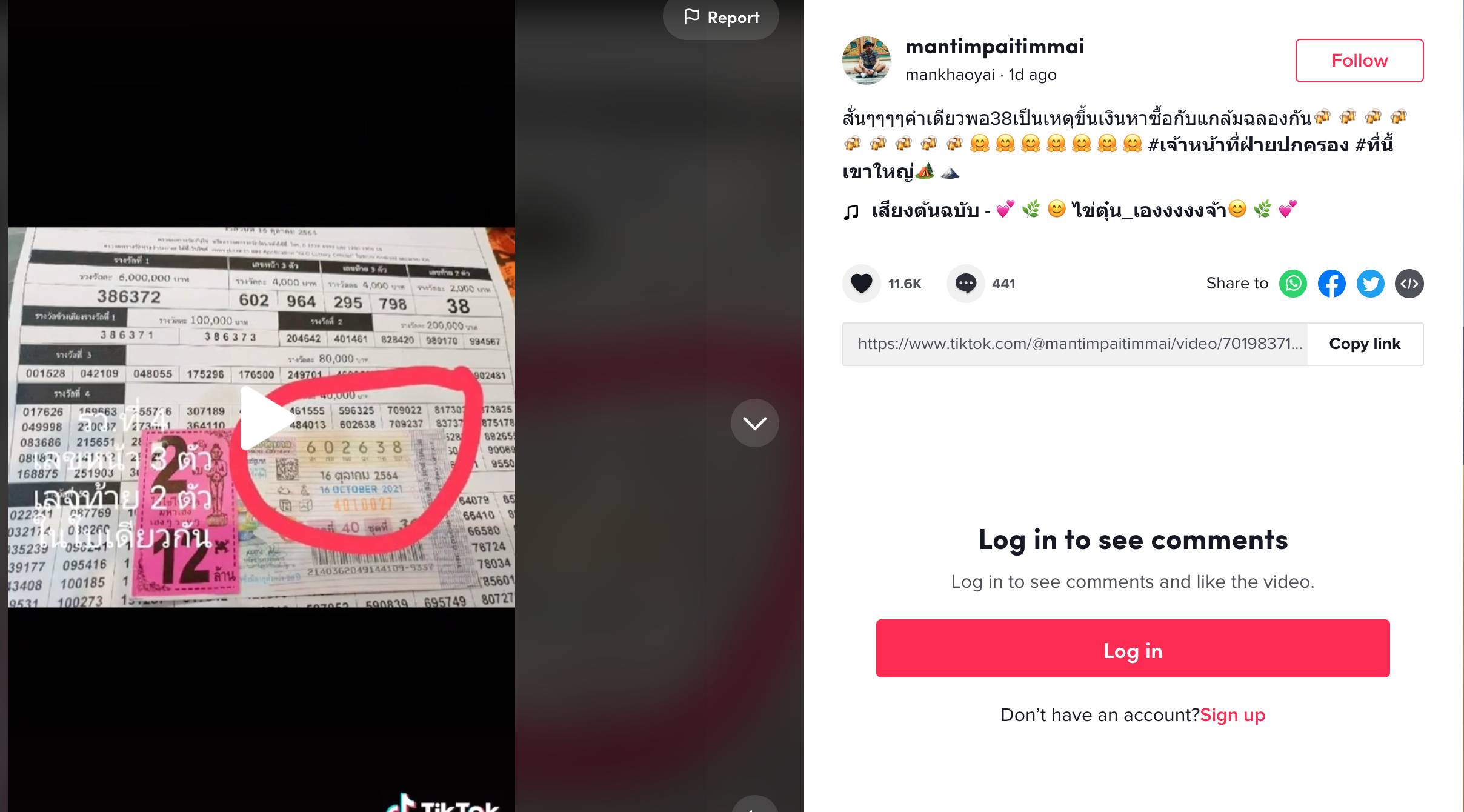 ผู้ใช้ TikTok ใช้ชื่อว่า @mantimpaitimmai ได้โพสต์ภาพการตรวจลอตเตอรี่หมายเลข 602638 ซึ่งพบว่าถูกรางวัลมากถึง 3 เด้ง พร้อมแคปชั่นว่า “สั่นๆ ๆ ๆ ๆ คำเดียวพอ 38 เป็นเหตุขึ้นเงินหาซื้อกับแกล้มฉลองกัน”