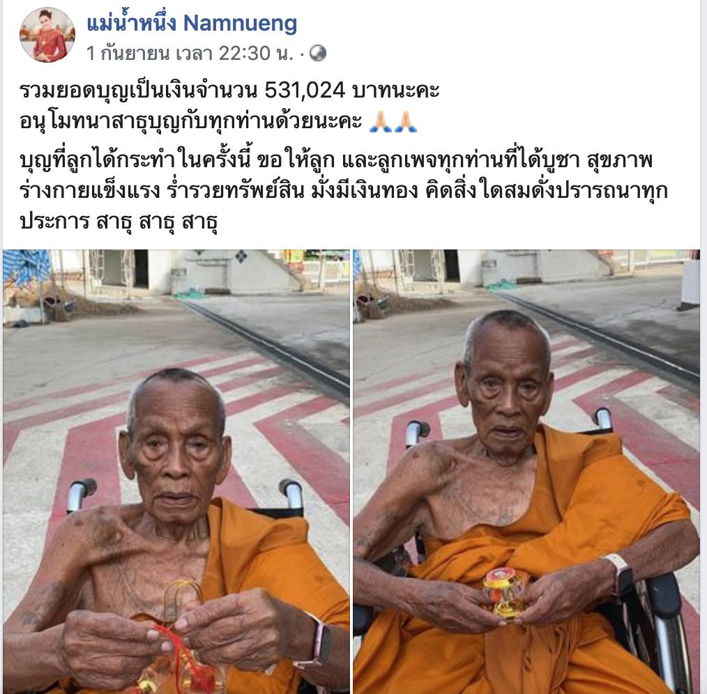 โดย แม่น้ำหนึ่ง ภิรดา โพสต์รูปภาพพระสงฆ์ และข้อความระบุว่า ” รวมยอดบุญเป็นเงินจำนวน 531,024 บาทนะคะ อนุโมทนาสาธุบุญกับทุกท่านด้วยนะคะ บุญที่ลูกได้กระทำในครั้งนี้ ขอให้ลูก และลูกเพจทุกท่านที่ได้บูชา สุขภาพร่างกายแข็งแรง ร่ำรวยทรัพย์สิน มั่งมีเงินทอง คิดสิ่งใดสมดั่งปรารถนาทุกประการ สาธุ สาธุ สาธุ “