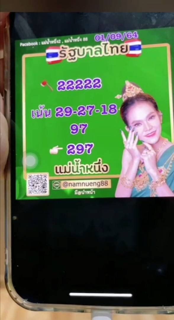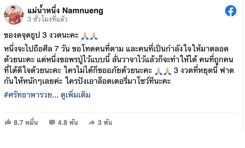 “ของดจุดธูป 3 งวดนะคะ หนึ่งจะไปถือศีล 7 วัน ขอโทษคนที่ตาม และคนที่เป็นกำลังใจให้มาตลอดด้วยนะคะ แต่หนึ่งขอพรปู่ไว้แบบนี้ ลั่นวาจาไว้แล้วก็จะทำให้ได้ คนที่ถูกคนที่ได้ดีใจด้วยนะคะ ใครไม่ได้ก็ขออภัยด้วยนะคะ 3 งวดที่หยุดนี้ ฟาดกันให้หนักๆ เลยค่ะ ใครปังเอาลอตเตอรี่มาโชว์ทีนะคะ”