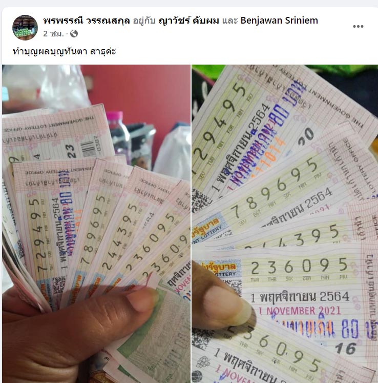 นางพรพรรณี กล่าวว่า กระทั่งเมื่อวันที่ 24 ตุลาคม 2564 ที่ผ่านมา ตนมาทำบุญทอดกฐินที่วัดอินทาราม มาเจอพระพุทธเจ้าน้อยที่นี่ ตนดีใจมาก เพราะไม่เคยเห็นที่ไหนในจังหวัดสมุทรสงคราม และยิ่งทราบว่า พระพุทธเจ้าน้อยองค์นี้ตอนที่เจ้าอาวาสวัดอินทารามสร้างเมื่อ 10 ปีก่อน ได้นำมวลสารสมเด็จวัดระฆังบรรจุไว้ด้วย จึงเข้าไปกราบไหว้ขอพรทำให้มีกำลังใจในการต่อสู้ทำงาน และเหมือนเห็นเลข 95 ลางๆ ตนจึงหาซื้อในจังหวัดสมุทรสงครามได้เพียง 5 ใบ จึงโทรศัพท์ฝากน้องชายที่กรุงเทพมหานครซื้อ 5 ใบ เมื่อหวยออกก็พบว่าถูกหวย 10 ใบ จึงนำส้มโอ 200 กิโลกรัม กว่า 100 ลูก และจุดประทัดแก้บน 1,000 นัดด้วย