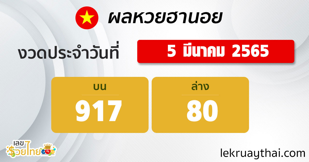 ตรวจหวยฮานอย 05/03/65 เช็คผลหวยฮานอยกับเว็บไซต์ หวยออนไลน์ ของคนไทย เลขรวยไทย ตรวจหวยฮานอยวันนี้ ผลหวยฮานอยย้อนหลัง เช็คผลหวยฮานอยวันนี้ เว็บไซต์ของเราอัพเดตและรายงานผลรวดเร็วไม่จำเป็นต้องรอนานอีกต่อไป