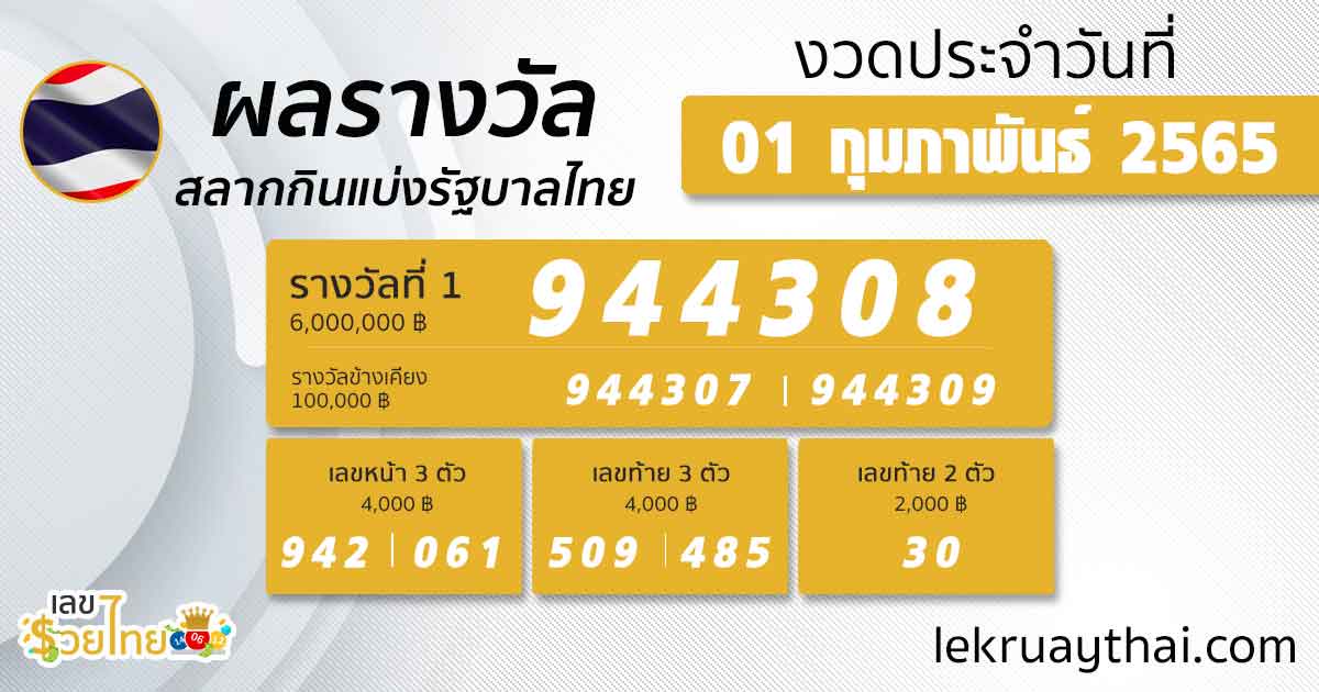ผลหวยรัฐบาล 01/02/65 สลากกินแบ่งรัฐบาลงวดวันที่ 01 กุมภาพันธ์ พ.ศ. 2565