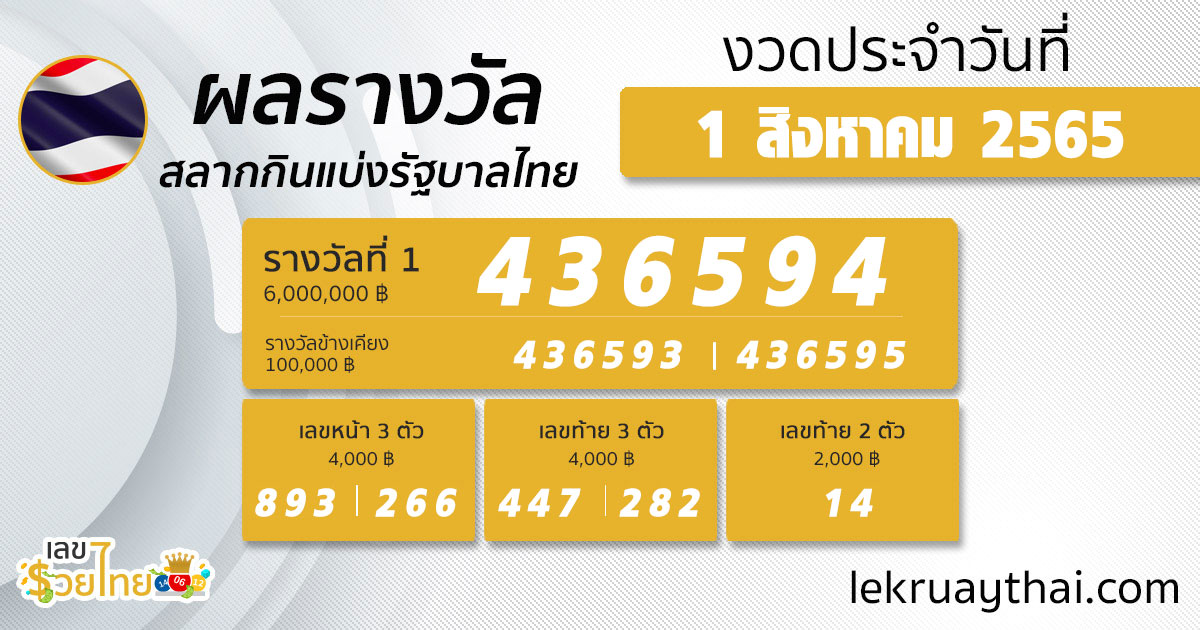 เช็ค ผลหวยรัฐบาล 01/08/65 บนเว็บ เลขรวยไทย