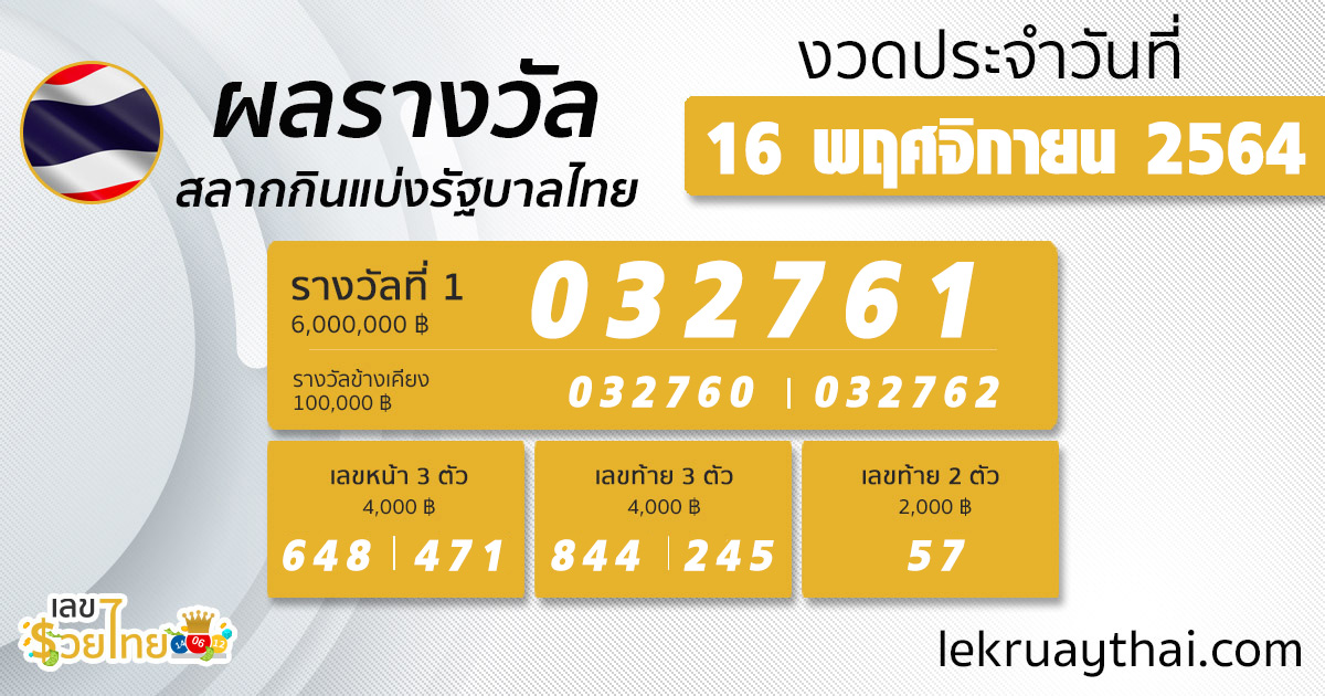 เช็ค ผลหวยรัฐบาล 16/11/64 บนเว็บ เลขรวยไทย