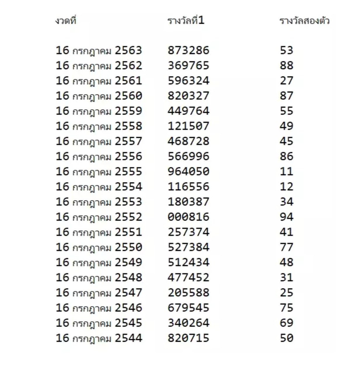 สรุป สถิติหวยไทยงวดวันที่ 16 กรกฎาคม 20 ปี เลขมาแรง